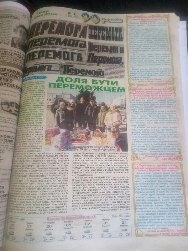 25 лютого 2022 року в редакції газети «Перемога» у Краснопіллі мало відбутися святкування, на яке запросили гостей: за два дні до того друкованому виданню виповнилося 90 років. “Святкувати не вийшло – почалася повномасштабна війна”, – згадує заступниця редактора газети «Перемога» Ольга Кисленко.